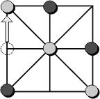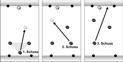 Hierbei positioniert der beginnende Spieler drei Steine in Form eines Dreiecks vor seinem Tor.